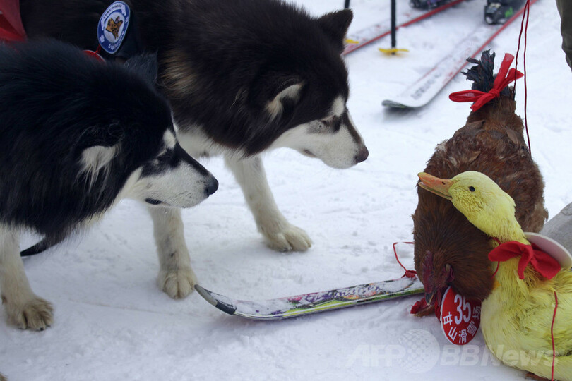 大会には犬や猫のほか、ニワトリやアヒルといった動物も参加した。40人の飼い主たちはペットをスキー板やそりに乗せて、あるいはリードをつけた動物を従えて雪のゲレンデを滑降した。