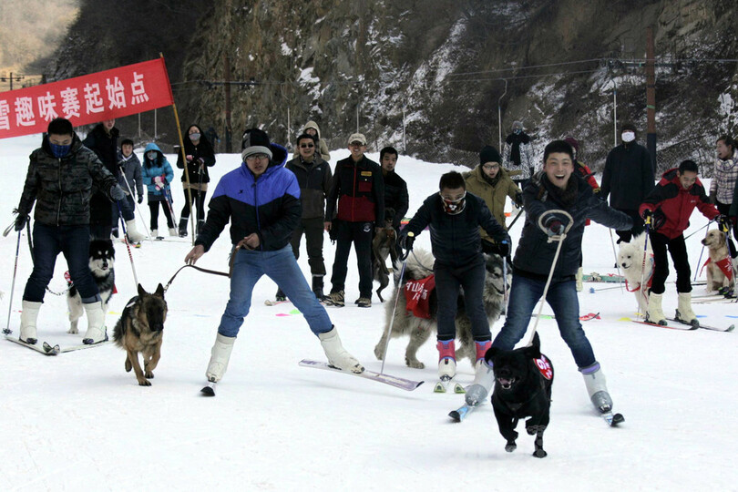 ペットのスキー大会でカメがウサギに勝つ、中国