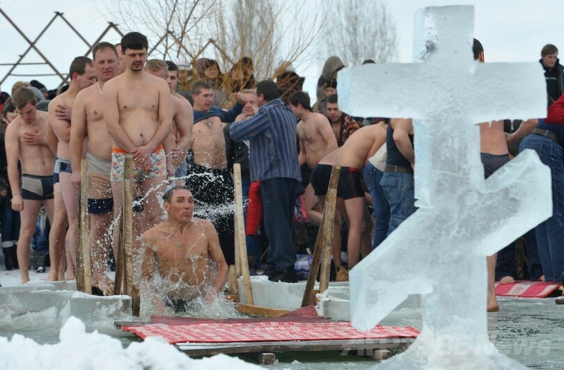 冷たい!凍った湖にざぶん、ロシア正教伝統行事