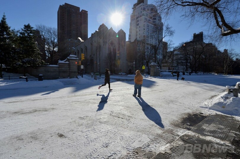 米国立測候所(National Weather Service、NWS)によると、10インチ(約25センチ)の積雪を記録したニューヨーク(New York)では、気温は高くても氷点下10度にとどまるとみられ、強風のため体感温度は氷点下25度と予想されている。(c)AFP
