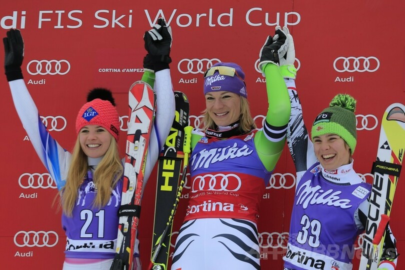 リヒテンシュタインのティナ・ワイラター(Tina Weirather)が0.31秒差で2位、オーストリアのニコル・シュミットホファー(Nicole Schmidhofer)が0.75秒差で3位に入った。(c)AFP