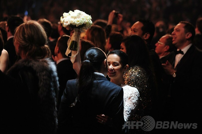 人種も外見もさまざまの34組には同性カップルの他、異性カップルの姿も。授賞式会場ステープルズ・センター(Staples Center)は聖歌隊が歌いまばゆい照明が輝く教会と化し、幸せいっぱいのカップルたちはステージ前で指輪を交換した。