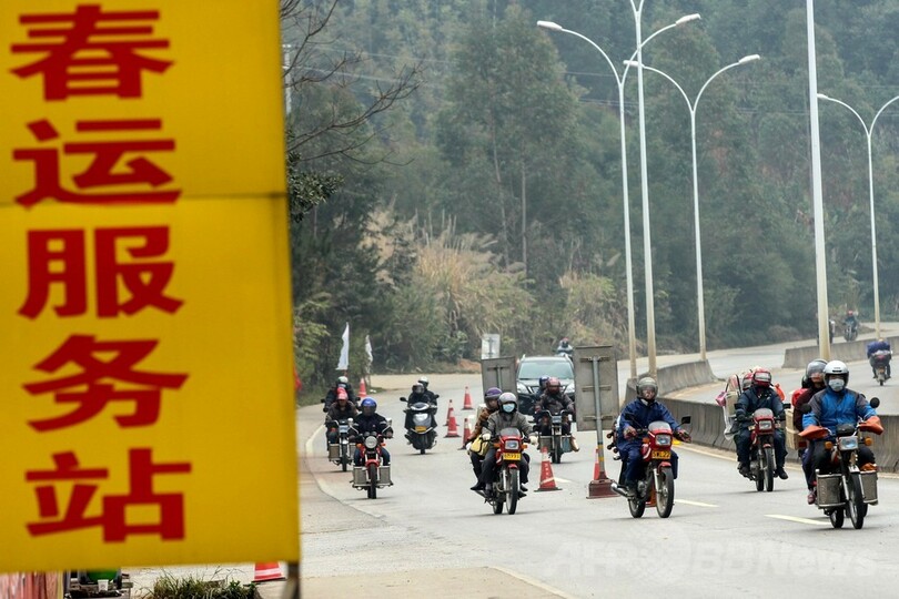 しかし国営メディアによると、今年はバイクで帰省する人が60万人を超えると見込まれており、同国最大の祝祭を故郷で過ごそうと数百キロという過酷な旅に挑んでいる。中には自転車でその流れに交ざっているつわものもいるという。(c)AFP/Tom HANCOCK