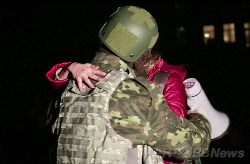 仲間の1人が女性に赤いバラの花束を手渡すそばで、男性は「ウクライナに栄光あれ!」と第2次世界大戦中から使われている伝統の民族主義スローガンを叫んだ。デモ隊の仲間たちも「英雄たちに栄光あれ!」と応じた。