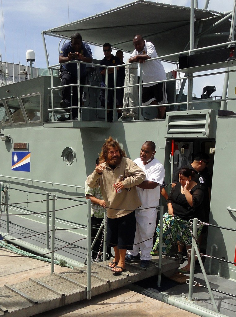 【2月3日 AFP】(一部更新)太平洋の島しょ国マーシャル諸島の環礁に漂着したところを先週発見され、太平洋を1年余り漂流していたと語っている男性が3日、マーシャル諸島の首都マジュロ(Majuro)に到着した。伸び放題のひげの男性はコーラを片手に、看護師の手を借りて警察の巡回船から降り立つと、港に詰め掛けた約1000人の見物人に笑顔で手を振ってみせた。