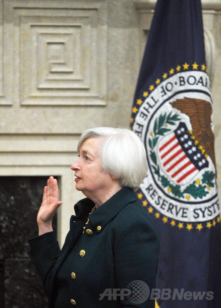 昨年10月にバラク・オバマ(Barack Obama)米大統領から新議長に指名されたイエレン氏は著名な経済学者で、14年間にわたりFRBの理事などを務めてきた。うち3年余りはFRB副議長としてバーナンキ前議長を支えてきたことから、インフレ抑制といまだに高い失業率の低減を両立させるという前議長と同じ路線を歩むとみられている。(c)AFP