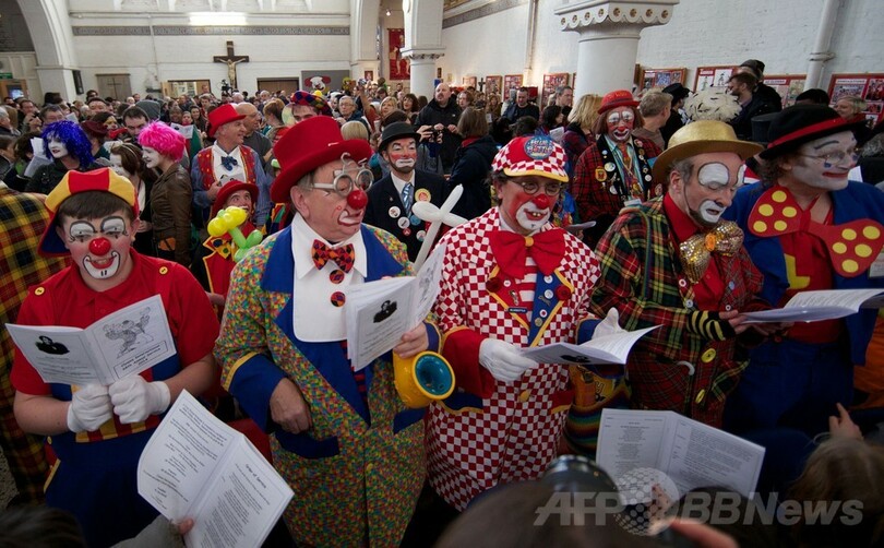 【2月5日 AFP】英国の道化師の祖と言われる「クラウン・ジョーイ(Clown Joey)」ことジョセフ・グリマルディ(Joseph Grimaldi、1837年死去)を称え、毎年ピエロたちが集まって行われている礼拝が今年も2日、英ロンドン東部ダルストン(Dalston)の教会で行われた。(c)AFP