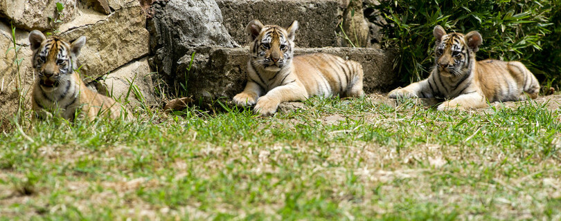 ママとくつろぐ三つ子のトラたち、南米コロンビア