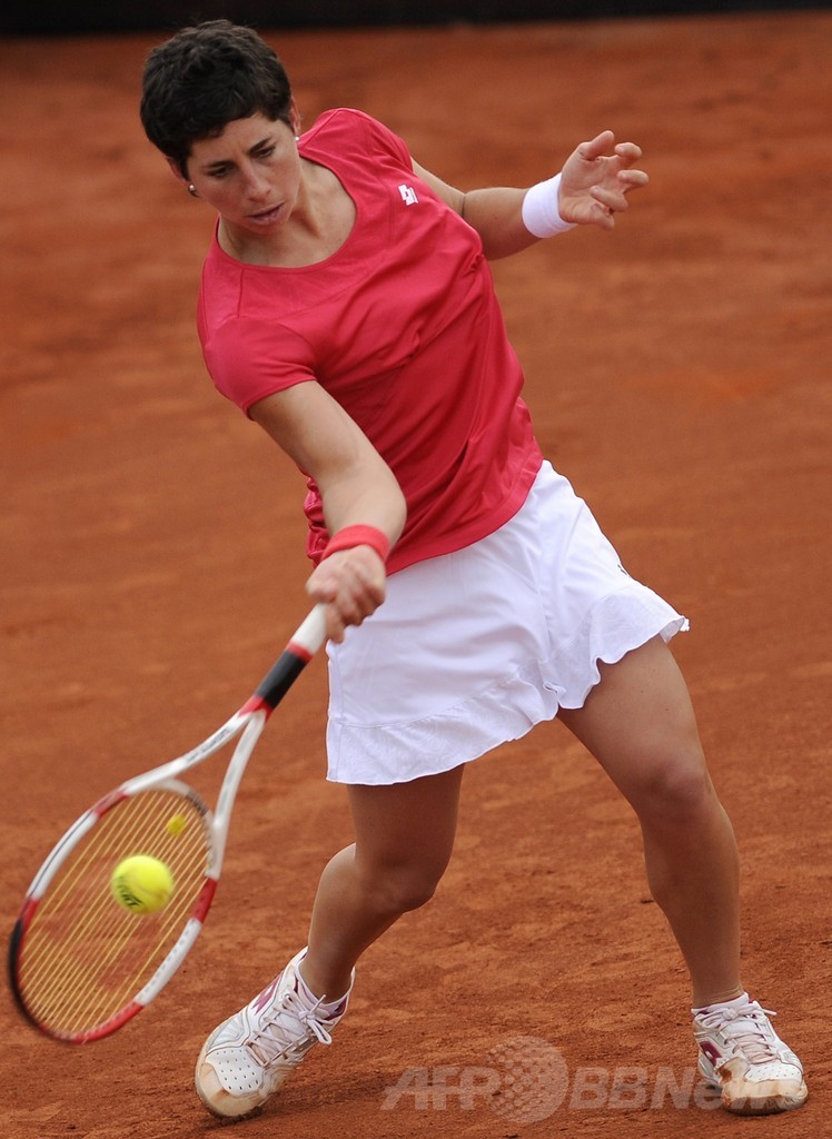 第1試合でスペインはカルラ・スアレス・ナバロ(Carla Suarez Navarro)が6-1、6-4でバーバラ・ザーロバ・ストリコバ(Barbora Zahlavova Strycova)を下して先行したものの、第2試合は雨のため9日に延期となった。(c)AFP