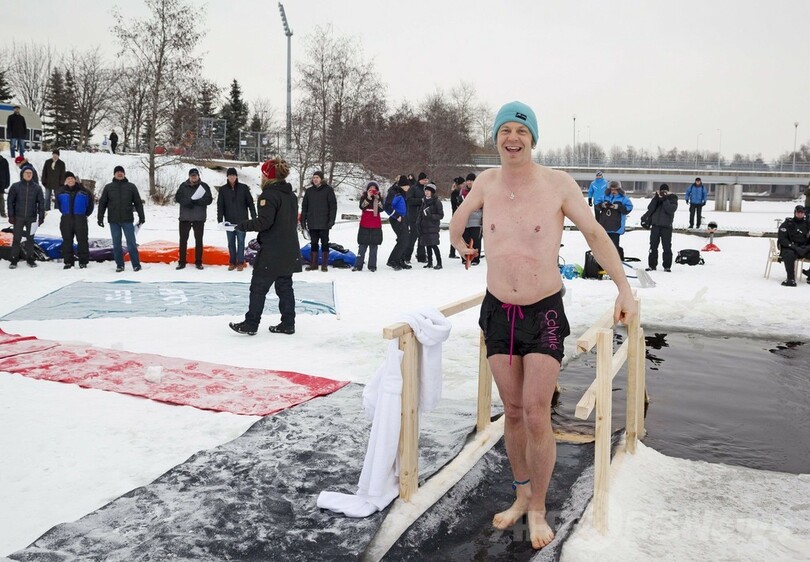水着とスイムキャップを着けただけの参加者は、オウル川(Oulujoki)に張った氷に開けられた穴に次々に飛び込み、歯をカチカチ言わせながら事業計画を説明した。