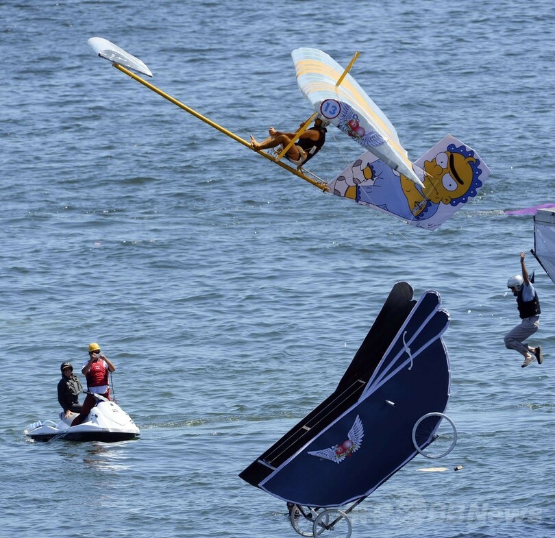 ドイツ語で「飛ぶ日」を意味する「フルークターク」では、自作の人力飛行機で高さ6メートルの発射台から海に向けて飛び立ち、飛距離を競う。(c)AFP