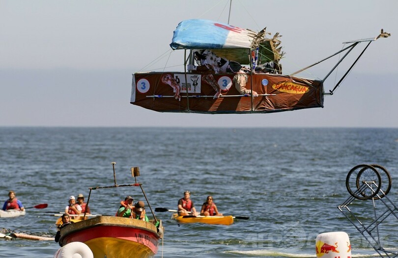 【2月10日 AFP】南米チリ中部バルパライソ(Valparaiso)で9日、人力飛行機コンテスト「フルークターク(Flugtag)」が開催された。