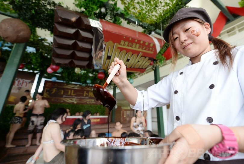 【2月11日 AFP】神奈川県箱根町の温泉テーマパーク「箱根小涌園ユネッサン(Hakone Kowakien Yunessun)」ではバレンタインシーズン恒例の「チョコレート風呂」が開催中だ。湯船に甘いチョコレートの香りが漂うこの風呂は、3月20日まで楽しむことができる。(c)AFP