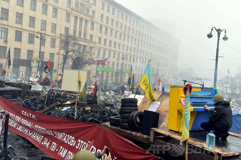 【2月11日 AFP】反政権デモ隊と機動隊との衝突が続くウクライナの首都キエフ(Kiev)で10日、反政権側がバリケードを築くフルシェウシキー(Grushevsky)通りにショパン(Frederic Chopin)のピアノの調べが響き渡った。
