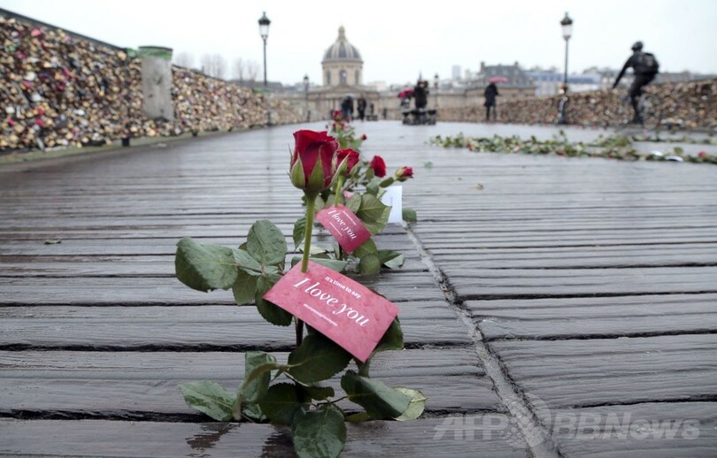時計メーカーがバレンタインデーに合わせて企画したもので、橋いっぱいに飾られたたくさんのバラの花には「今こそ愛を告白する時」とのメッセージが添えられている。ポンデザール橋は、欄干のフェンスに恋人たちが南京錠をかけて愛を誓う名所として知られる。(c)AFP