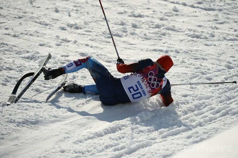 準決勝に出場したロシアのアントン・ガファロフ(Anton Gafarov)選手は、高速でヘアピンカーブに差し掛かったとろで転倒。それでもゴールに向け、起き上がって足を引きずりながら前に進もうとしたが、左足に履いていたスキー板は完全に壊れていた。