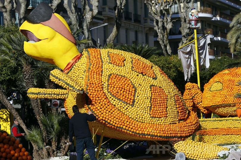 【2月16日 AFP】南仏コート・ダジュール(French riviera、フレンチリビエラ)のマントン(Menton)で14日、毎年恒例の「レモン祭り(Fete du Citron)」の開幕に向けたオレンジとレモンの巨大オブジェ作りが大詰めを迎えた。