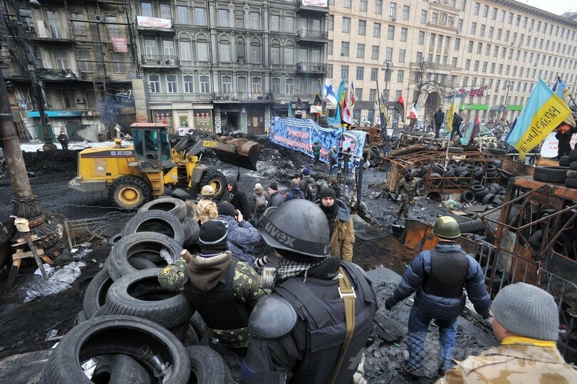 ウクライナでは、親ロシア路線をとるビクトル・ヤヌコビッチ(Viktor Yanukovych)大統領が欧州連合(EU)との連合協定への署名を見送ったことがきっかけで起きた反政権デモが、警官隊との衝突に発展。国内は3か月近くにわたる混乱に陥り、首都キエフ(Kiev)では市庁舎などが2か月間にわたって占拠されていた。