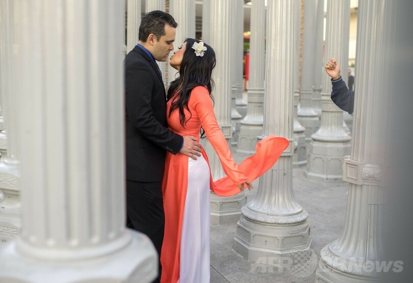 【2月18日 AFP】米カリフォルニア(California)州のロサンゼルス郡立美術館(Los Angeles County Museum of Art)前に08年に設置された現代美術家、故クリス・バーデン(Chris Burden)の作品「アーバンライト(Urban Light)」が、結婚したカップルの間で記念写真を撮影する人気スポットとなっている。