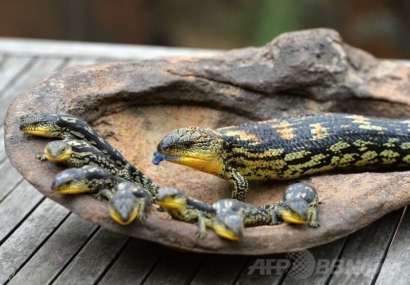 【2月18日 AFP】オーストラリア・シドニー(Sydney)にある動物園「ワイルドライフ・シドニー・ズー(Wild Life Sydney Zoo)」で18日、最近生まれたマダラアオジタトカゲの子ども7匹が母トカゲと一緒に初めて来園者に公開された。(c)AFP