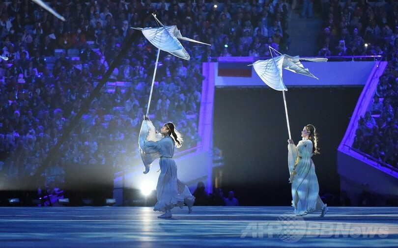 開会式では五輪の一つが欠けるという思わぬトラブルに見舞われたが、閉会式ではこれを逆手に取り、きらびやかな衣装に身を包んだパフォーマーたちが人文字のように四輪を形作ると、残りの1つが最後に開き五輪になるという仕掛けを演出した。