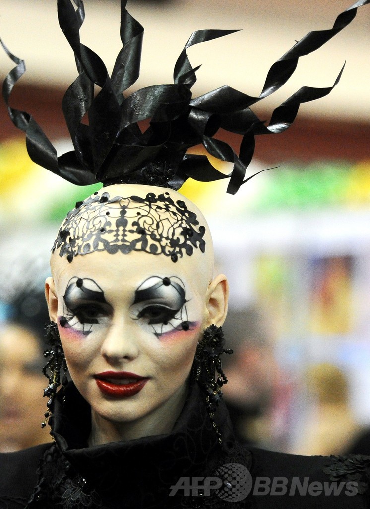 【2月24日 AFP】ロシア第2の都市サンクトペテルブルク(St.Petersburg)で開催された国際美容見本市「ネフスキー ベレガ(Nevskie Berega)」で22日、モデルたちが奇抜なデザインで彩られたファッションやヘアメーク、ボディーペインティングなどの作品を披露した。(c)AFP