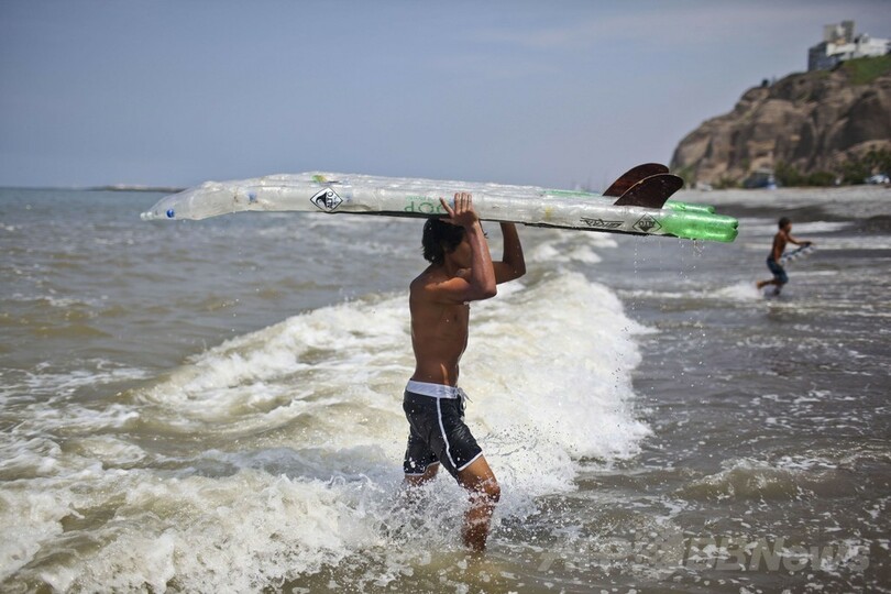 ニュース 環境・科学 こぼれ話 ペットボトルボードでエコサーフィン、南米ペルー 2014年2月28日 12:47 発信地:リマ/ペルー [ 中南米 ペルー ] このニュースをシェア ‹ › ❮ 7/10 ❯ 南米ペルー首都リマ(Lima)の海で、ペットボトルで作られたサーフボードを持つ少年(2014年2月27日撮影)。(c)AFP/ERNESTO BENAVIDES 画像作成中 ! 【2月28日 AFP】南米ペルーの首都リマ(Lima)の海で27日、ペットボトルで作られたサーフボードで波乗りをする少年たちの姿が見られた。これは環境問題への意識向上を促す「エコサーフ(ECOSURF)」プロジェクトの一環で、使い捨てのペットボトルでできたサーフボードを使ったサーフィンのレッスンなどが開催されている。(c)AFP 環境・科学 一覧へ> メディア・報道関係・法人の方向け 写真・動画 購入のお問合せ>