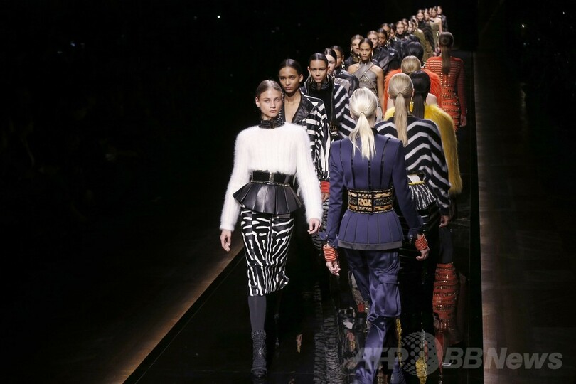 27日には「バルマン(Balmain)」が新作を発表し、ランウェイにはモデルのカーリー・クロス(Karlie Kloss)やジョアン・スモールズ(Joan Smalls)、ロージー・ハンティントン=ホワイトリー(Rosie Huntington-Whiteley)らが登場した。(c)AFP