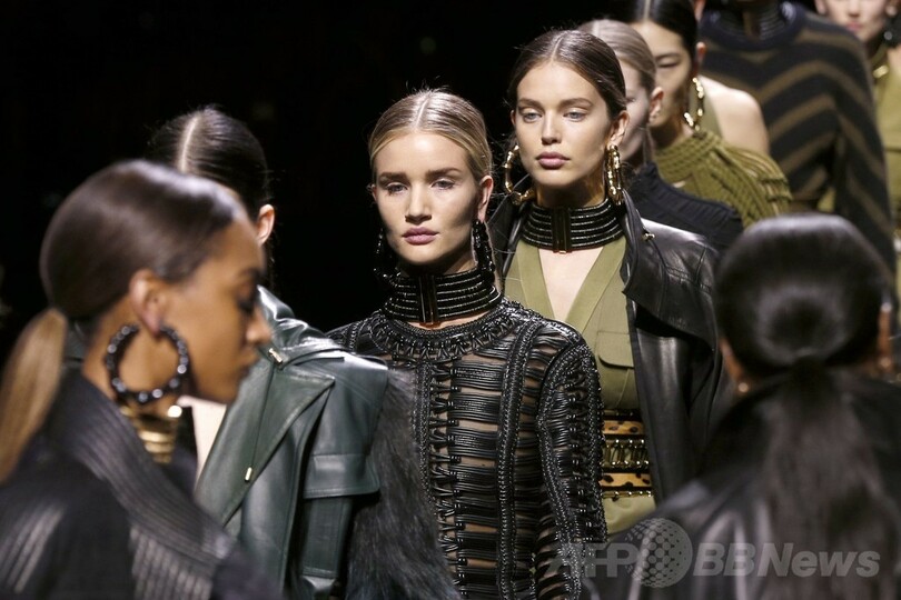 27日には「バルマン(Balmain)」が新作を発表し、ランウェイにはモデルのカーリー・クロス(Karlie Kloss)やジョアン・スモールズ(Joan Smalls)、ロージー・ハンティントン=ホワイトリー(Rosie Huntington-Whiteley)らが登場した。(c)AFP