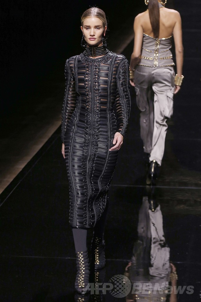 27日には「バルマン(Balmain)」が新作を発表し、ランウェイにはモデルのカーリー・クロス(Karlie Kloss)やジョアン・スモールズ(Joan Smalls)、ロージー・ハンティントン=ホワイトリー(Rosie Huntington-Whiteley)らが登場した。(c)AFP