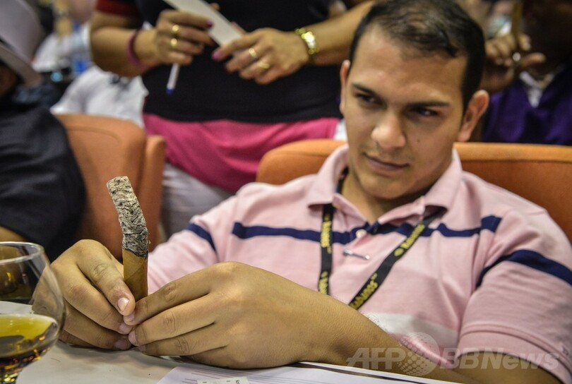 【2月28日 AFP】葉巻が特産のキューバの首都ハバナ(Havana)では現在、「ハバナ葉巻フェスティバル(Habano Cigar Festival)」が開かれている。27日には吸い殻の「灰の長さ」を競うコンテストが開催され、会場では多くの参加者たちが天井を見上げるようにして葉巻を吹かす姿が見られた。
