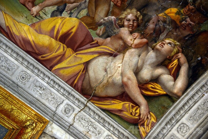 【2月28日 AFP】盛期ルネサンス(Hgh Renaissance)の最重要建築の一つ、イタリア・ローマ(Rome)のファルネーゼ宮(Farnese Palace)。その一室、天井装飾画のある「ガレリア・ファルネーゼ(Galleria Farnese)」が、3月から1年かけて修復される。ファルネーゼ宮は現在、フランス大使館として使われている。(c)AFP