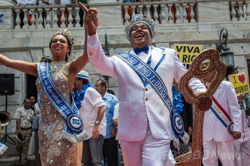 開幕のシンボルである「市の鍵」の受け渡しが行われ、エドゥアルド・パエス(Eduardo Paes)市長がカーニバルの象徴である「キング・モモ(King Momo)」役のウィウソン・ジーアス・ダコスタ・ネト(Wilson Dias da Costa Neto)さんと「クイーン」のレティシア・マルティンス・ギマライス(Leticia Martins Guimaraes)さんに鍵を手渡すと、5日間に及ぶノンストップの盛大な祭りが正式に開幕した。(c)AFP