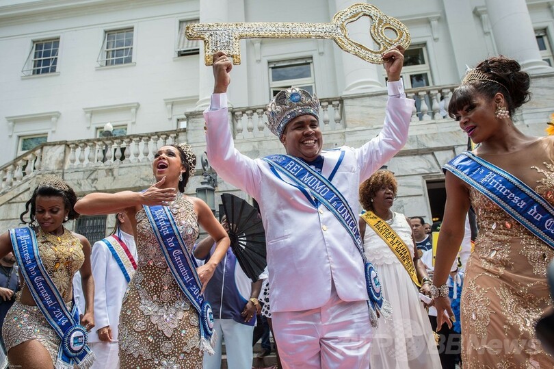 開幕のシンボルである「市の鍵」の受け渡しが行われ、エドゥアルド・パエス(Eduardo Paes)市長がカーニバルの象徴である「キング・モモ(King Momo)」役のウィウソン・ジーアス・ダコスタ・ネト(Wilson Dias da Costa Neto)さんと「クイーン」のレティシア・マルティンス・ギマライス(Leticia Martins Guimaraes)さんに鍵を手渡すと、5日間に及ぶノンストップの盛大な祭りが正式に開幕した。(c)AFP