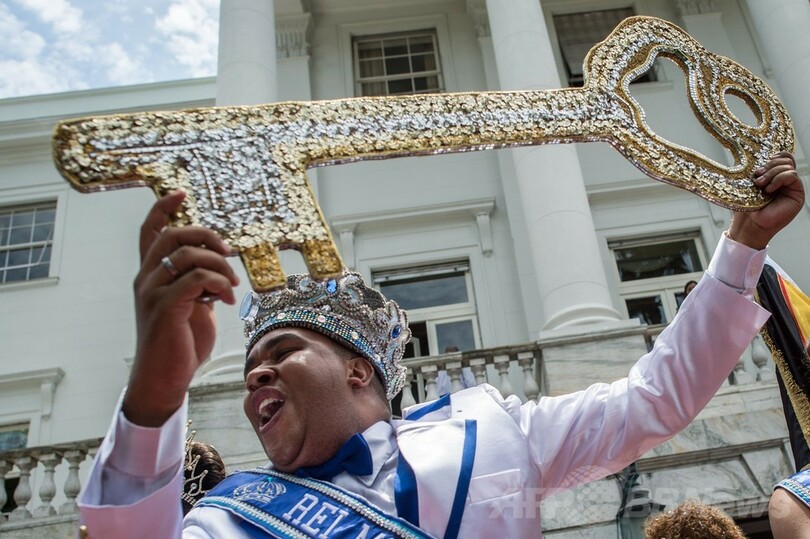 開幕のシンボルである「市の鍵」の受け渡しが行われ、エドゥアルド・パエス(Eduardo Paes)市長がカーニバルの象徴である「キング・モモ(King Momo)」役のウィウソン・ジーアス・ダコスタ・ネト(Wilson Dias da Costa Neto)さんと「クイーン」のレティシア・マルティンス・ギマライス(Leticia Martins Guimaraes)さんに鍵を手渡すと、5日間に及ぶノンストップの盛大な祭りが正式に開幕した。(c)AFP