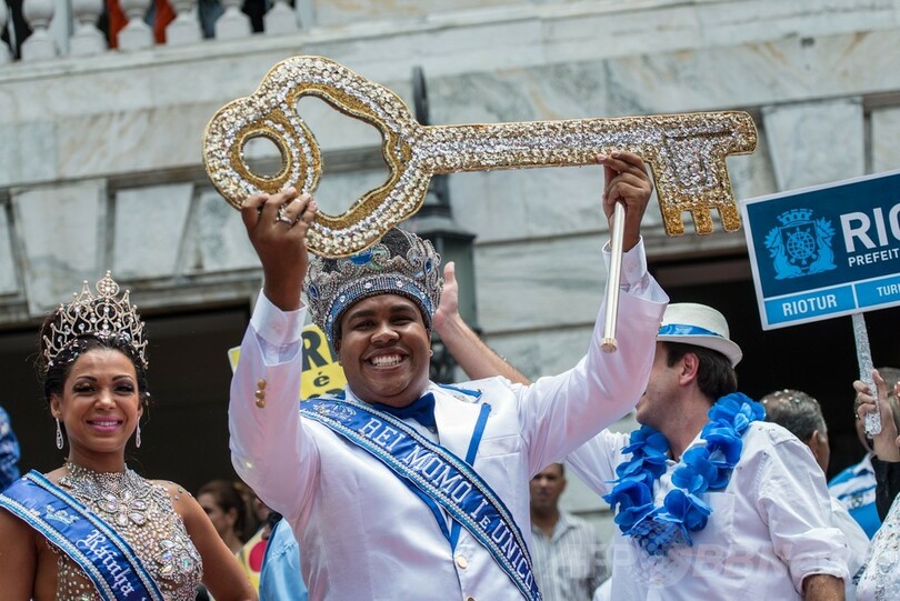 開幕のシンボルである「市の鍵」の受け渡しが行われ、エドゥアルド・パエス(Eduardo Paes)市長がカーニバルの象徴である「キング・モモ(King Momo)」役のウィウソン・ジーアス・ダコスタ・ネト(Wilson Dias da Costa Neto)さんと「クイーン」のレティシア・マルティンス・ギマライス(Leticia Martins Guimaraes)さんに鍵を手渡すと、5日間に及ぶノンストップの盛大な祭りが正式に開幕した。(c)AFP
