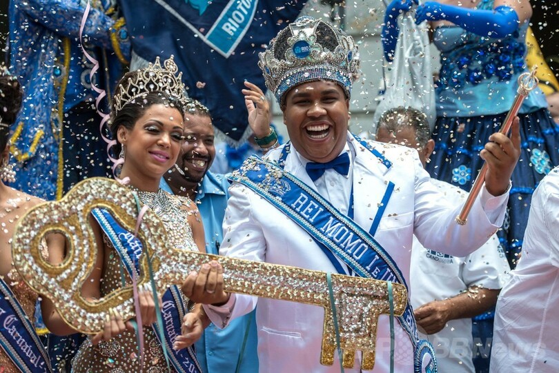 開幕のシンボルである「市の鍵」の受け渡しが行われ、エドゥアルド・パエス(Eduardo Paes)市長がカーニバルの象徴である「キング・モモ(King Momo)」役のウィウソン・ジーアス・ダコスタ・ネト(Wilson Dias da Costa Neto)さんと「クイーン」のレティシア・マルティンス・ギマライス(Leticia Martins Guimaraes)さんに鍵を手渡すと、5日間に及ぶノンストップの盛大な祭りが正式に開幕した。(c)AFP