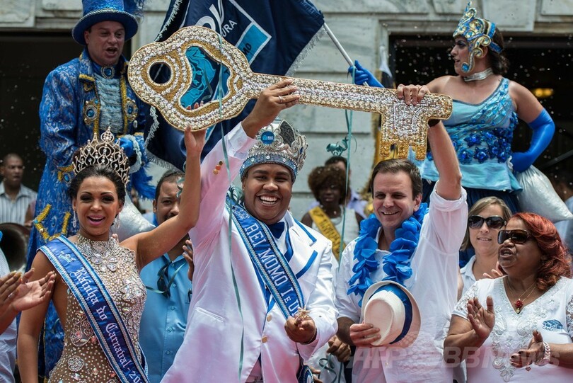開幕のシンボルである「市の鍵」の受け渡しが行われ、エドゥアルド・パエス(Eduardo Paes)市長がカーニバルの象徴である「キング・モモ(King Momo)」役のウィウソン・ジーアス・ダコスタ・ネト(Wilson Dias da Costa Neto)さんと「クイーン」のレティシア・マルティンス・ギマライス(Leticia Martins Guimaraes)さんに鍵を手渡すと、5日間に及ぶノンストップの盛大な祭りが正式に開幕した。(c)AFP