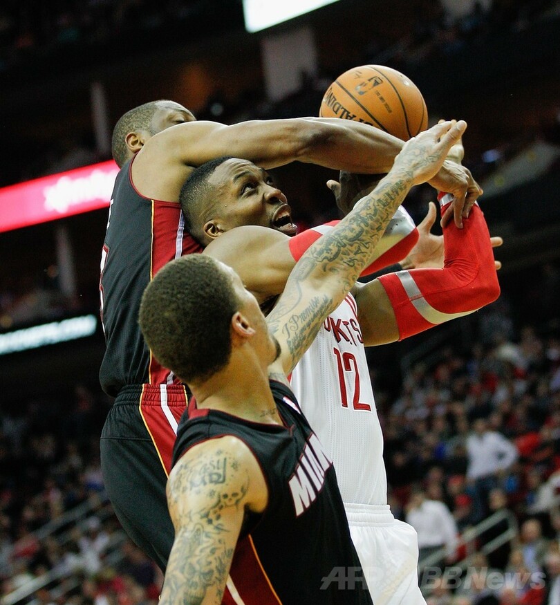 しかし、ロケッツはそこから7得点を追加すると、それ以降はヒートに並ばれることはなく、終盤にビーズリーの3ポイントシュートで点差を詰められたものの、最後はハワードがブザーと同時に同点の3ポイントを狙ったジェームズに手を伸ばし、シュートミスを誘った。(c)AFP