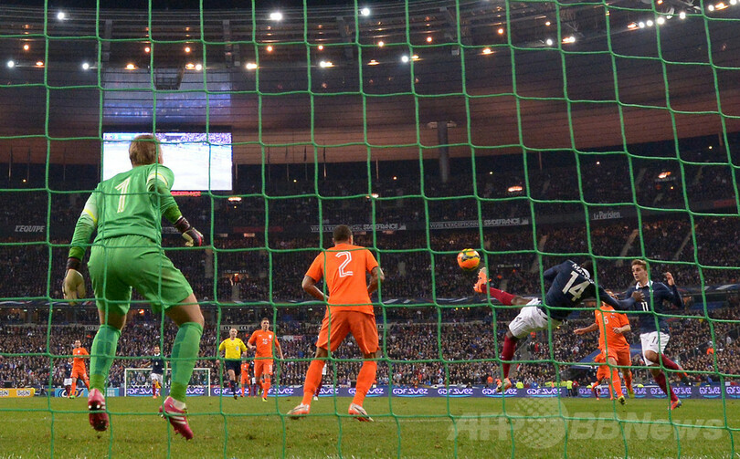 そしてハーフタイムを迎える3分前に記録されたフランスの追加点は、ベンゼマの右サイドに展開したパスから生まれ、ボールを受けたマチュー・ヴァルブエナ(Mathieu Valbuena)のクロスを、ゴール前に走り込んでいたマテュイディがアクロバティックな体勢から得点を挙げた。