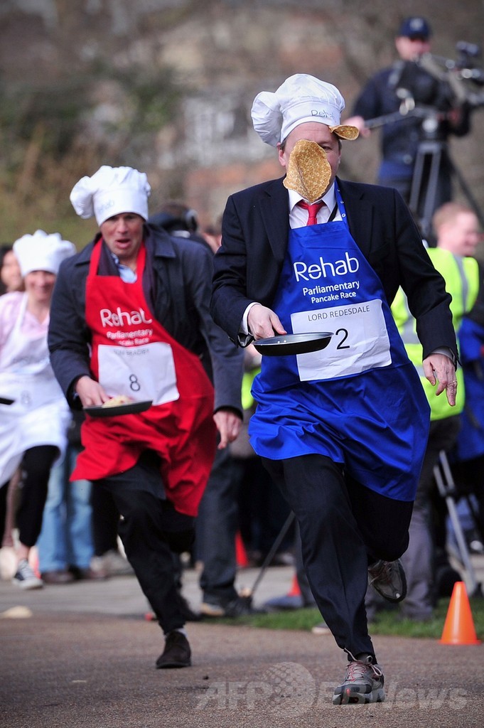 【3月5日 AFP】キリスト教の「四旬節(Lent)」が始まる前日の「告解の火曜日(Shrove Tuesday)」に当たった4日、英議会恒例のパンケーキレースがロンドン(London)中心部で催され、コック帽にエプロン姿の議員たちがフライパンの上でパンケーキを返しながら疾走した。