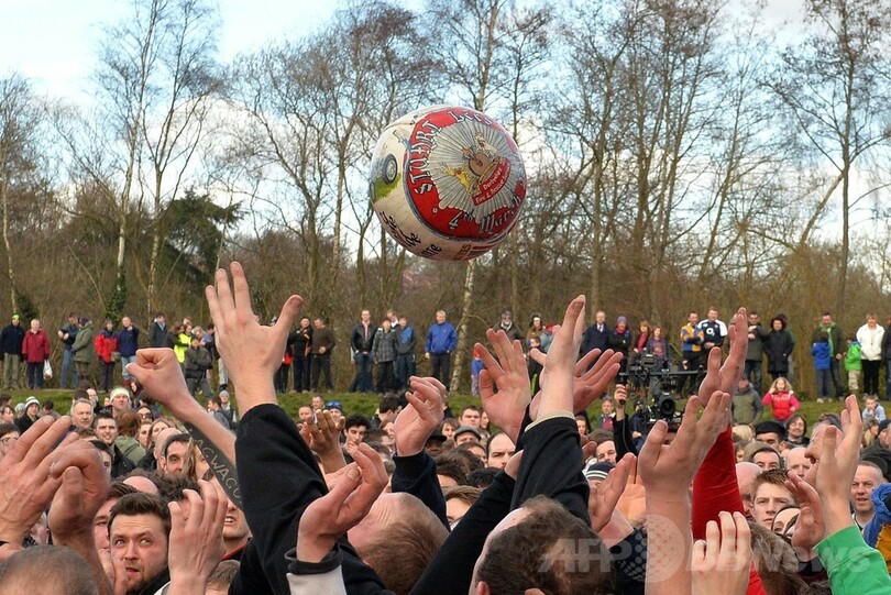 【3月5日 AFP】英イングランド中部ダービーシャー(Derbyshire)州アッシュボーン(Ashbourne)で4日、町中が総出で参加する伝統のフットボール大会「ロイヤル・シュローブタイド・フットボール(Royal Shrovetide Football)」が開催された。