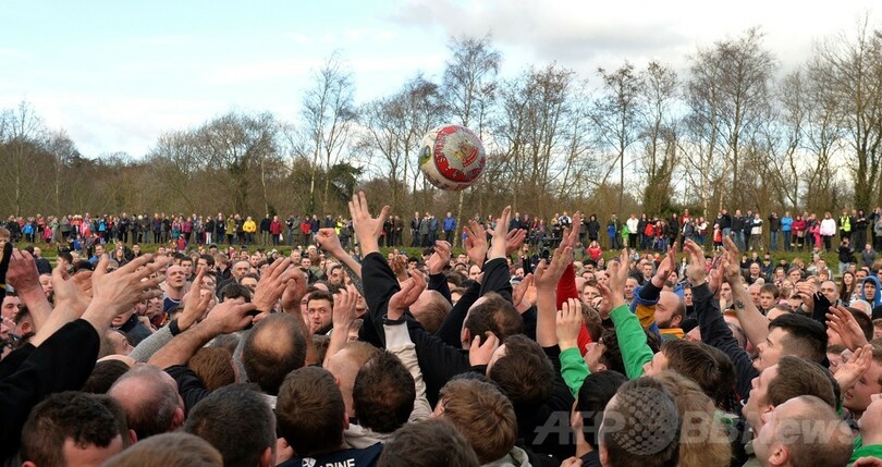 【3月5日 AFP】英イングランド中部ダービーシャー(Derbyshire)州アッシュボーン(Ashbourne)で4日、町中が総出で参加する伝統のフットボール大会「ロイヤル・シュローブタイド・フットボール(Royal Shrovetide Football)」が開催された。