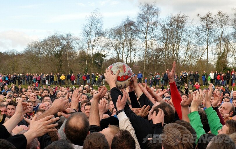 アッシュボーンの住民たちは、街の真ん中を流れるヘンモア(Henmore)川を境にどちら側に生まれたかによって、「アッパーズ(Up’ards、上手チーム)」と「ダウナーズ(Down’Ards、下手チーム)」に別れて試合を行う。(c)AFP