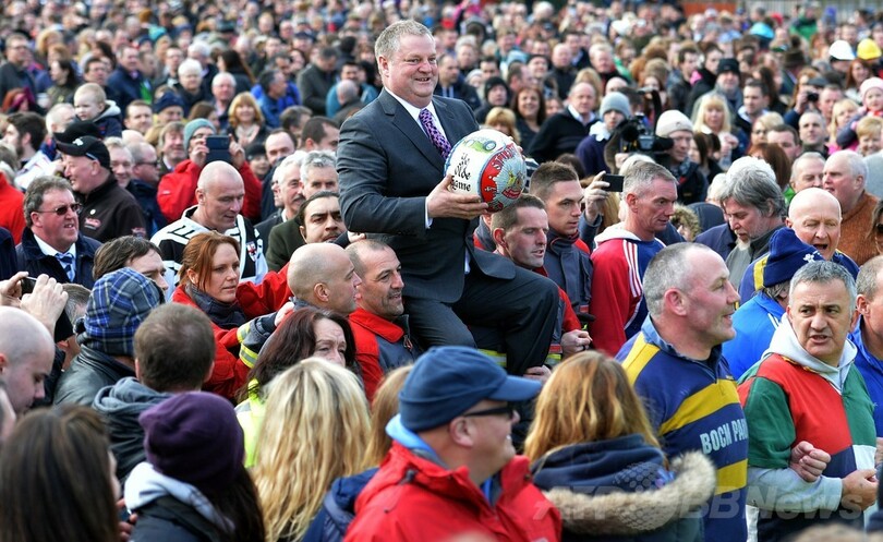 【3月5日 AFP】英イングランド中部ダービーシャー(Derbyshire)州アッシュボーン(Ashbourne)で4日、町中が総出で参加する伝統のフットボール大会「ロイヤル・シュローブタイド・フットボール(Royal Shrovetide Football)」が開催された。