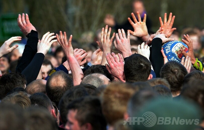 【3月5日 AFP】英イングランド中部ダービーシャー(Derbyshire)州アッシュボーン(Ashbourne)で4日、町中が総出で参加する伝統のフットボール大会「ロイヤル・シュローブタイド・フットボール(Royal Shrovetide Football)」が開催された。