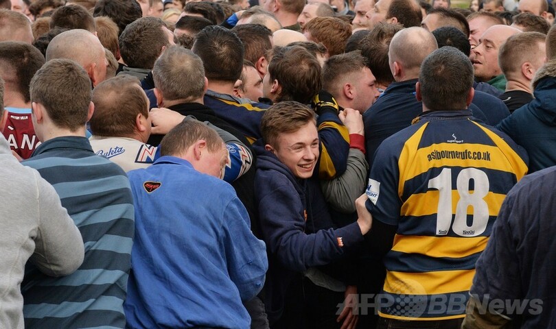 【3月5日 AFP】英イングランド中部ダービーシャー(Derbyshire)州アッシュボーン(Ashbourne)で4日、町中が総出で参加する伝統のフットボール大会「ロイヤル・シュローブタイド・フットボール(Royal Shrovetide Football)」が開催された。