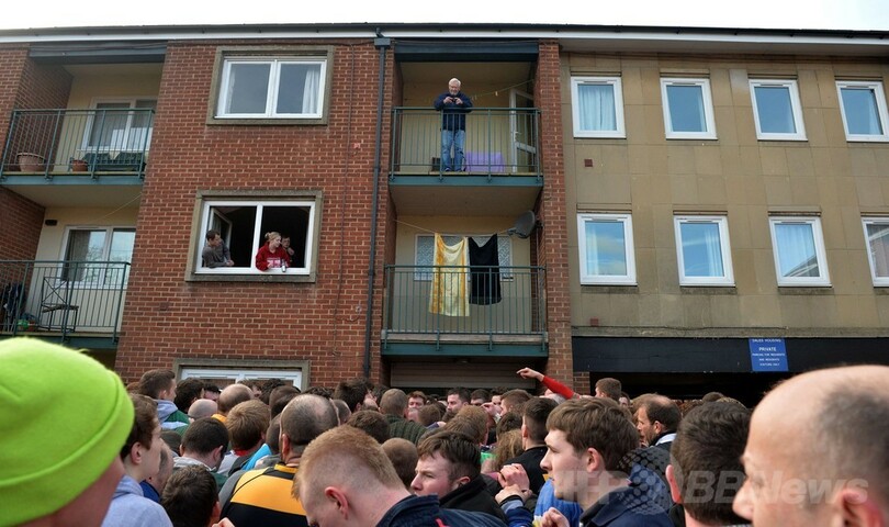 【3月5日 AFP】英イングランド中部ダービーシャー(Derbyshire)州アッシュボーン(Ashbourne)で4日、町中が総出で参加する伝統のフットボール大会「ロイヤル・シュローブタイド・フットボール(Royal Shrovetide Football)」が開催された。