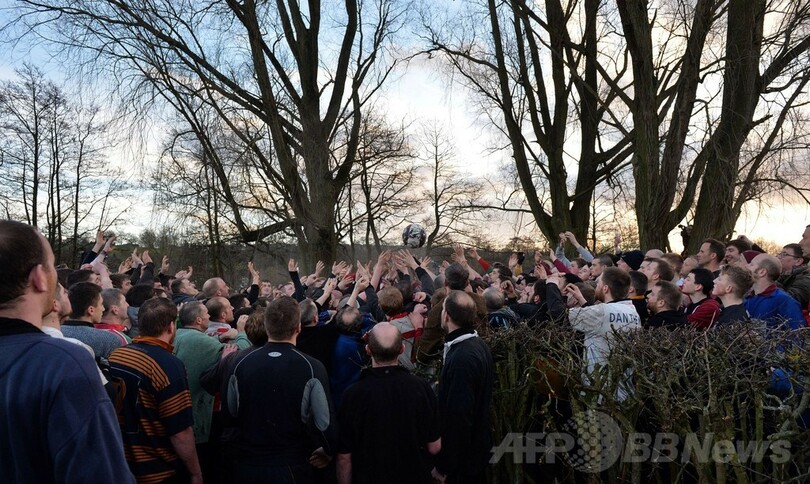 【3月5日 AFP】英イングランド中部ダービーシャー(Derbyshire)州アッシュボーン(Ashbourne)で4日、町中が総出で参加する伝統のフットボール大会「ロイヤル・シュローブタイド・フットボール(Royal Shrovetide Football)」が開催された。