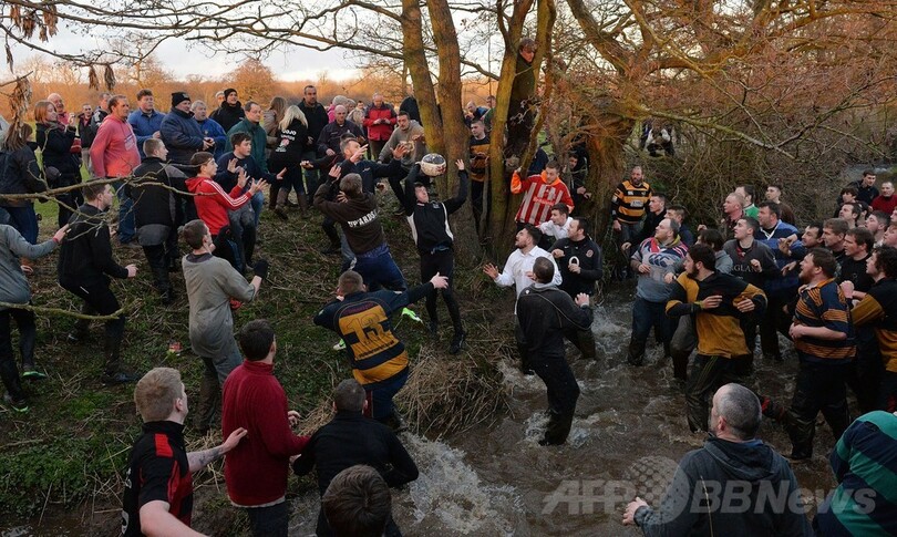 アッシュボーンの住民たちは、街の真ん中を流れるヘンモア(Henmore)川を境にどちら側に生まれたかによって、「アッパーズ(Up’ards、上手チーム)」と「ダウナーズ(Down’Ards、下手チーム)」に別れて試合を行う。(c)AFP